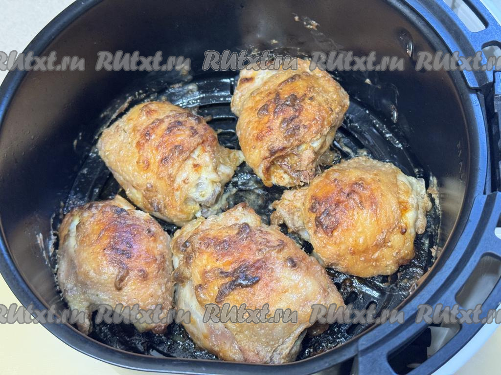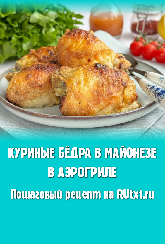Бёдрышки достать из чаши аэрогриля, разложить по тарелкам и, дополнив гарниром, подать к столу. Запечённые куриные бёдра, благодаря майонезу, получаются сочными, вкусными, покрытыми хрустящей корочкой. Приготовьте это мясное блюдо и оно отлично разнообразит ваше повседневное меню!