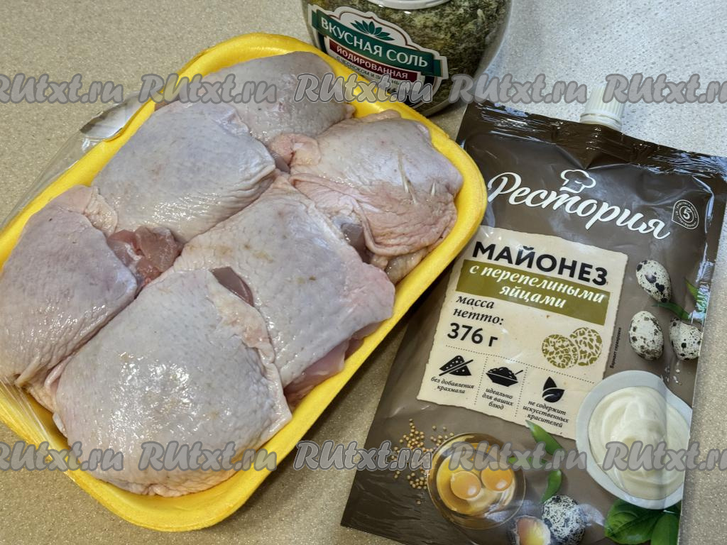 Куриные бёдра промыть водой, обсушить, выложить в глубокую миску, добавить майонез, всыпать соль (добавляя соль, учитывайте, что майонез достаточно солёный) и специи.