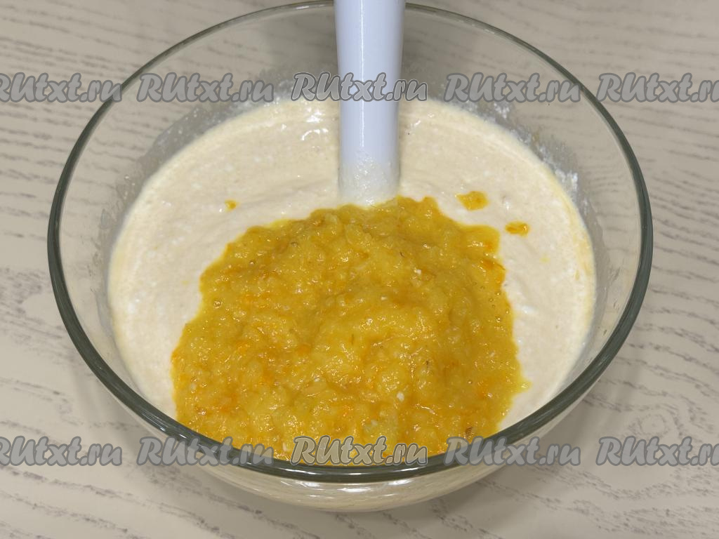 В ёмкость с однородной творожной массой выложить апельсиновую массу, перемешать творожно-апельсиновую массу погружным блендером до однородности.
