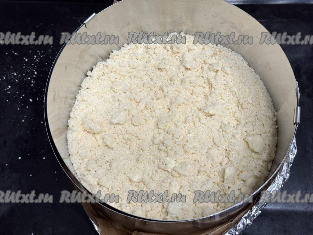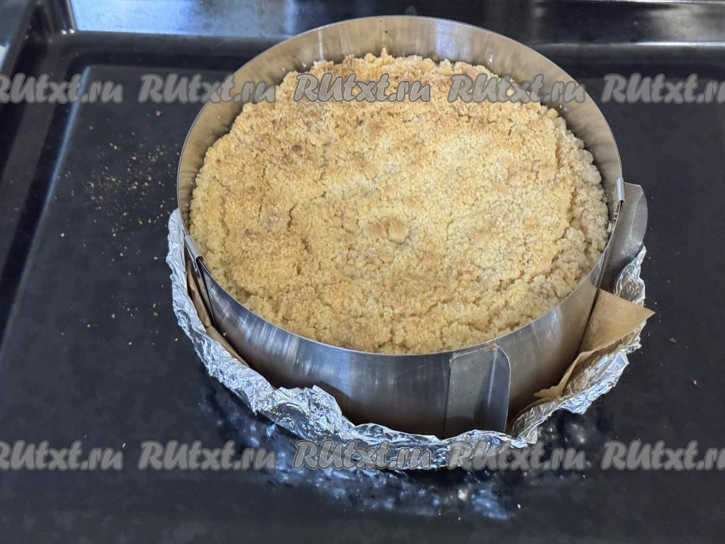 В разъёмную форму для выпечки диаметром 24 сантиметра насыпать 1/2 песочного теста-крошки, слегка утрамбовать.