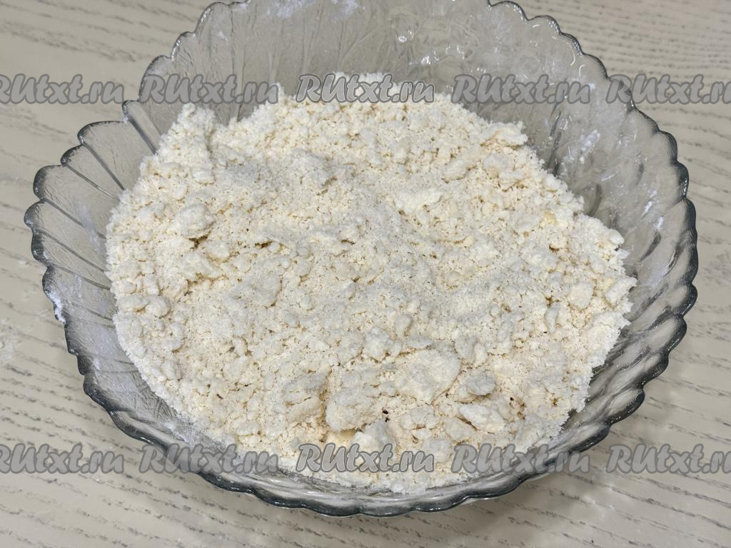 Содержимое миски перетереть руками до получения однородной, достаточно мелкой песочной крошки. Поставить миску с тестом-крошкой в холодильник на время, пока будем заниматься начинкой.