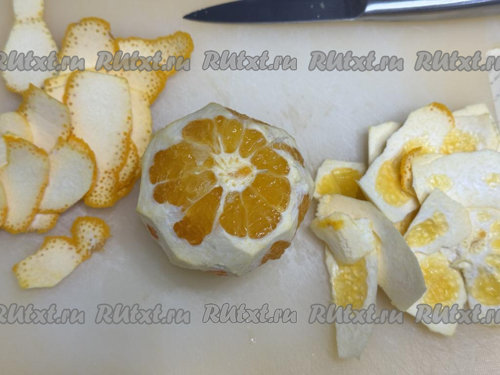 С апельсина снять тонкий оранжевый слой. Затем срезать с апельсина белый слой - этот слой нам не потребуется.