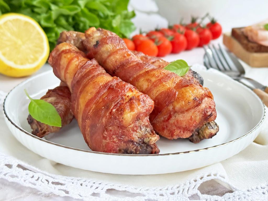 Аэрогриль позволяет приготовить немало аппетитных, вкусных мясных блюд. В этот раз решила запечь в аэрогриле куриные ножки, завёрнутые в полоски бекона. Готовится это блюдо достаточно просто. Ножки получаются очень вкусными, ароматными, сочными и нежными. Такие куриные ножки можно подать с любым гарниром или с салатом из свежих овощей.