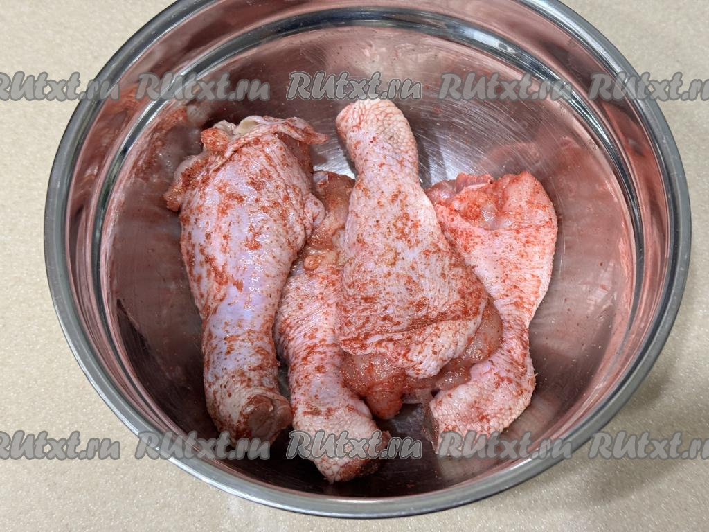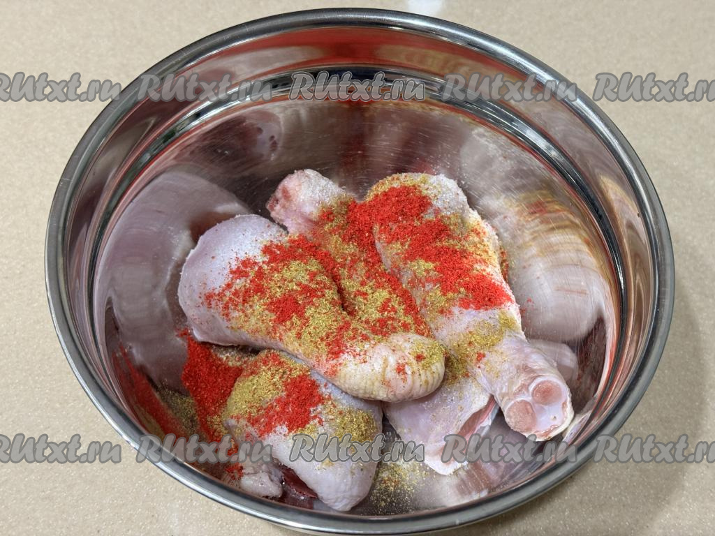 Куриные ножки выложить в миску, всыпать соль и специи (в качестве специй я добавила паприку и карри).