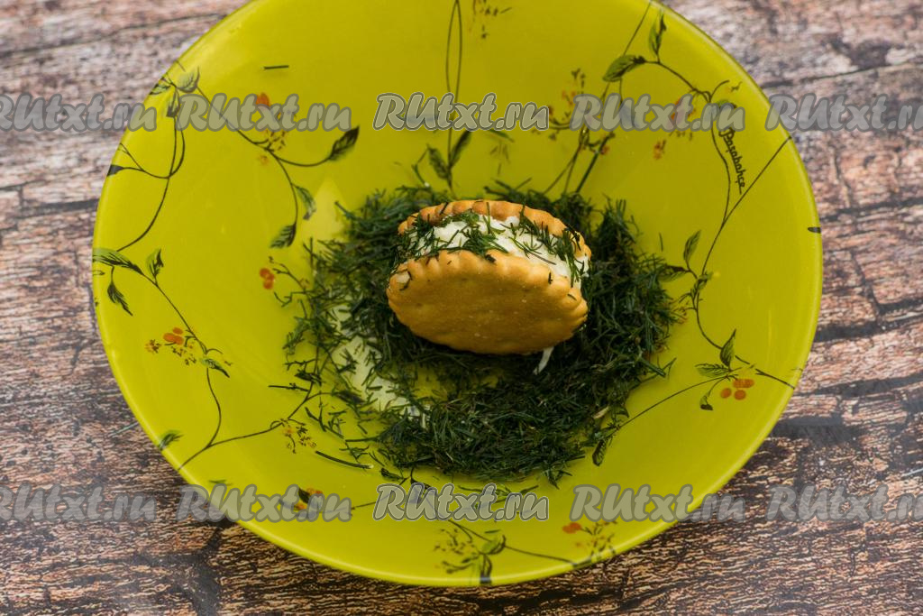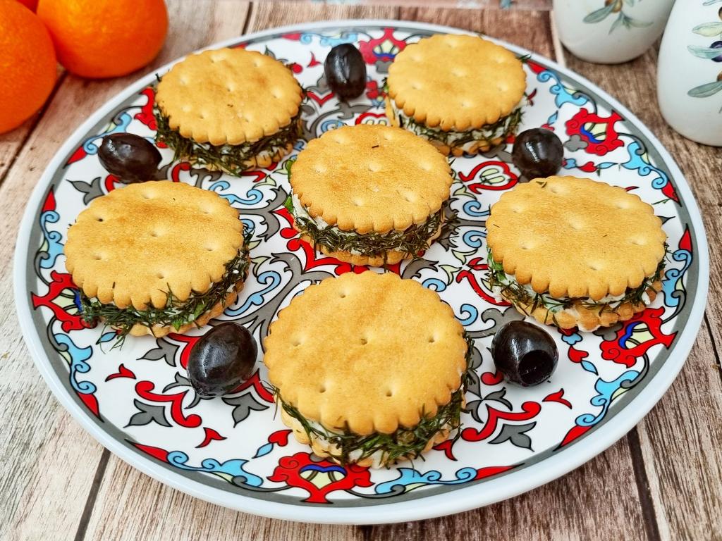 Каждую закуску из крекеров обвалять с боков в мелко нарезанной зелени (я обваляла в укропе).