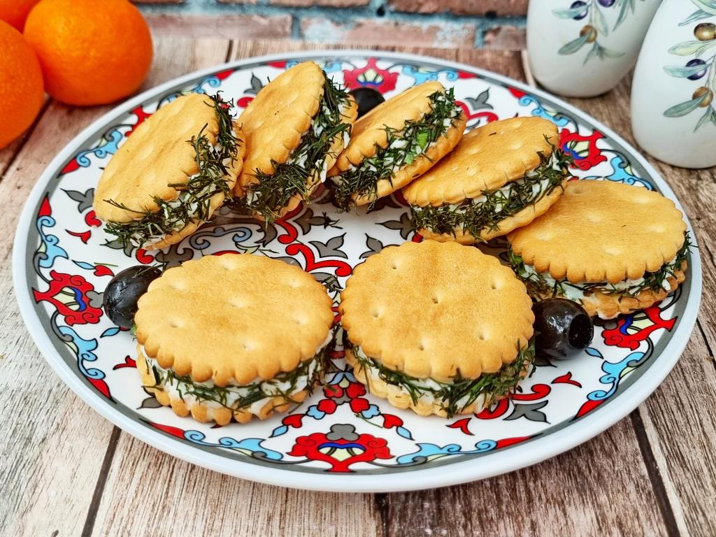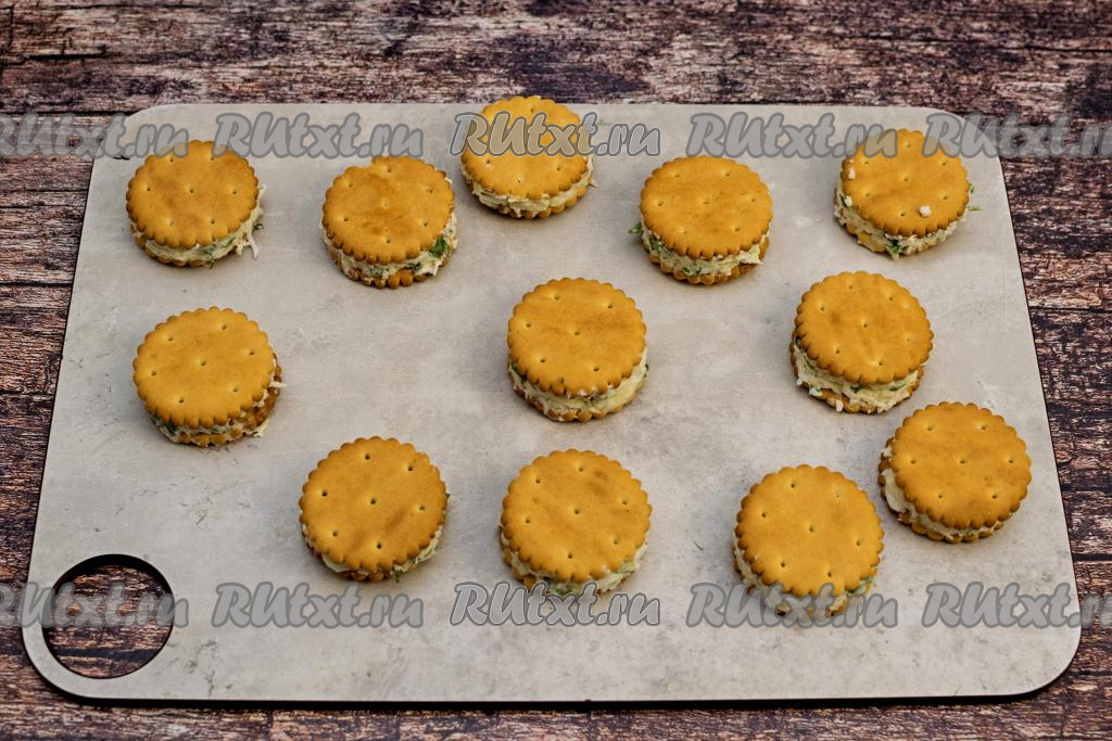 Для этой закуски лучше всего подойдут солёные крекеры любой формы и размера. У меня были круглые сырные крекеры.