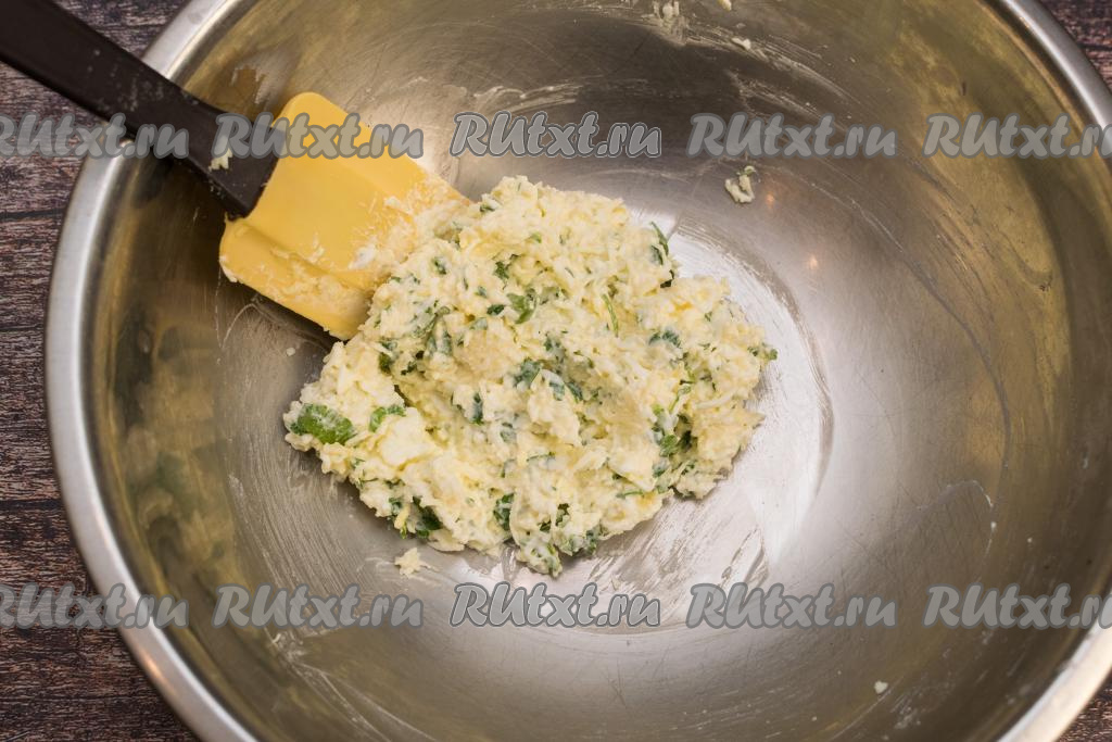 Зелень вымыть, обсушить, мелко нарезать. Добавить 3 столовых ложки нарезанной зелени в миску.