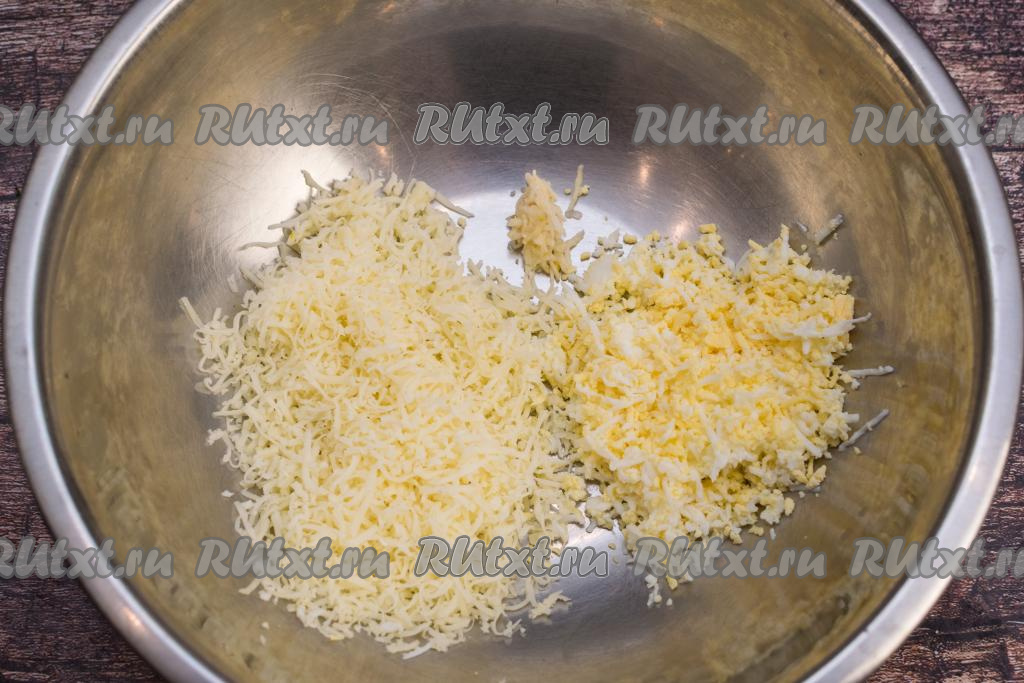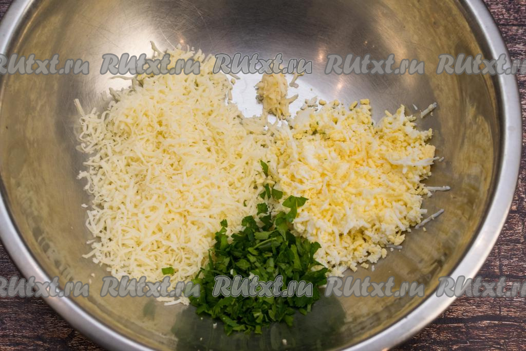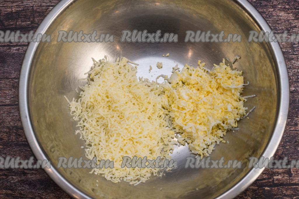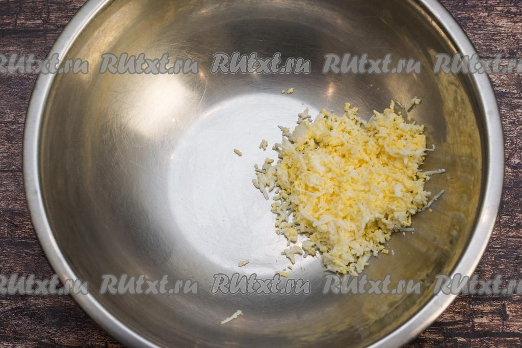 Прежде всего нужно отварить яйца в течение 10 минут после начала закипания воды. Затем яйца нужно полностью остудить, очистить, натереть на мелкой тёрке в глубокую миску.