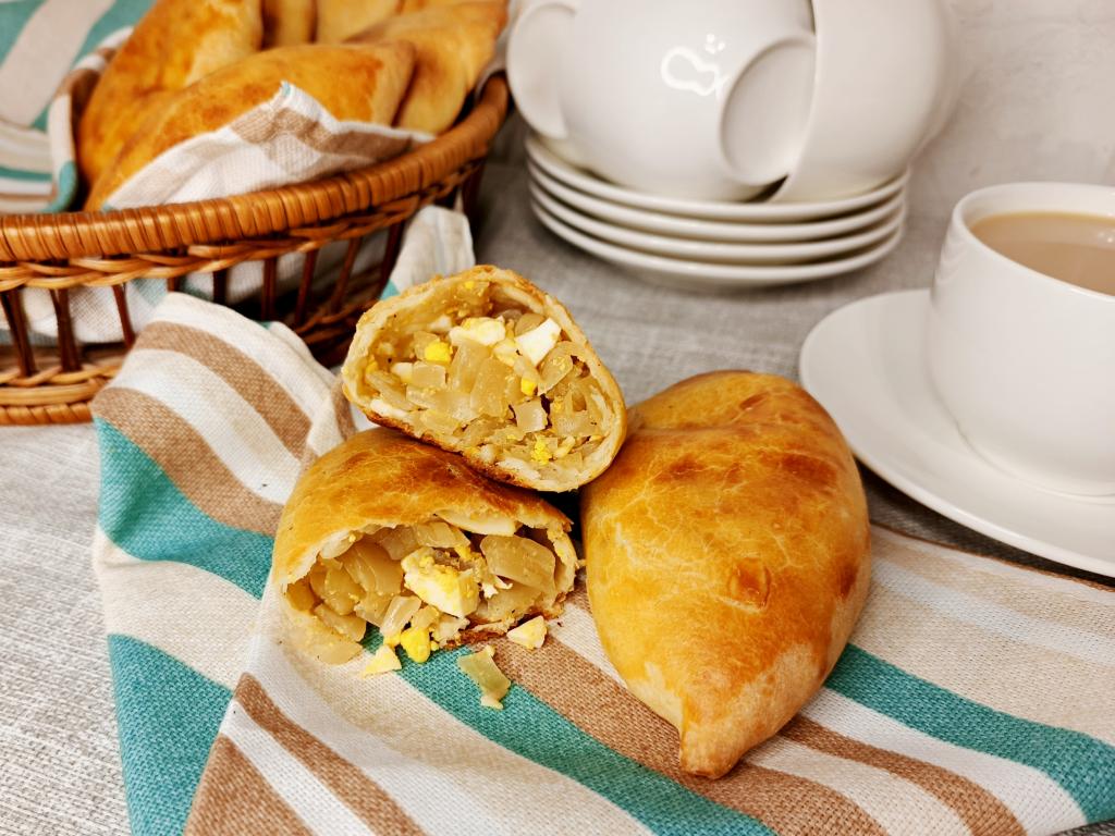 Ароматные, румяные бездрожжевые пирожки с капустой достать из духовки. Сразу испечь оставшиеся пирожки из теста, замешанного на кефире.