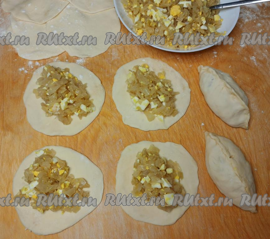 В центр каждой лепёшки выложить примерно 2 столовых ложки начинки из жареной капусты и варёных яиц. Защипнуть края каждой лепёшки над капустой начинкой, формируя пирожки. Таким образом сформировать все 28 пирожков с капустой.
