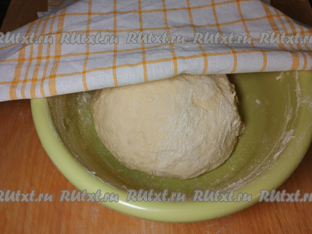 В общей сложности вымешивать тесто руками нужно не менее 5 минут. Затем бездрожжевое тесто собрать в шар, накрыть полотенцем и оставить "отдохнуть" на 15 минут.