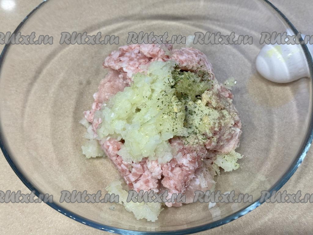 В миске соединить фарш и измельченные лук с чесноком, добавить соль и перец по вкусу.
