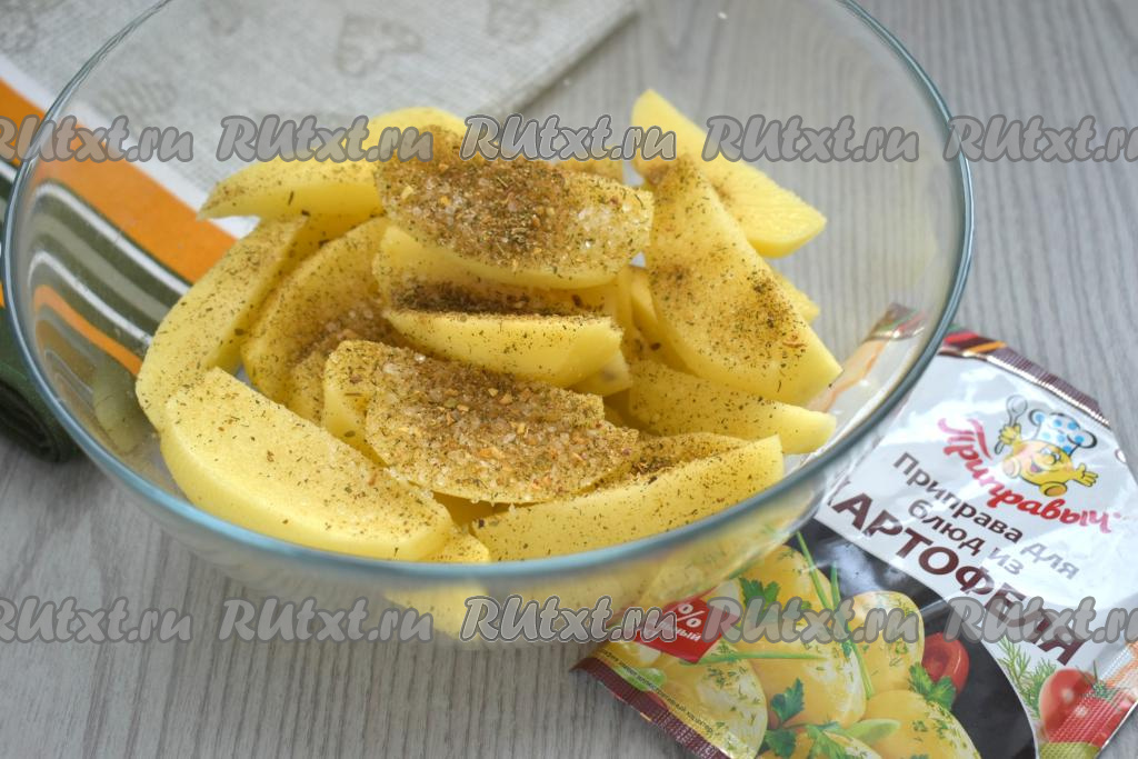 К ломтикам картошки всыпаем любимые специи (я добавила 1 чайную ложку приправы для картофеля) и соль по вкусу.