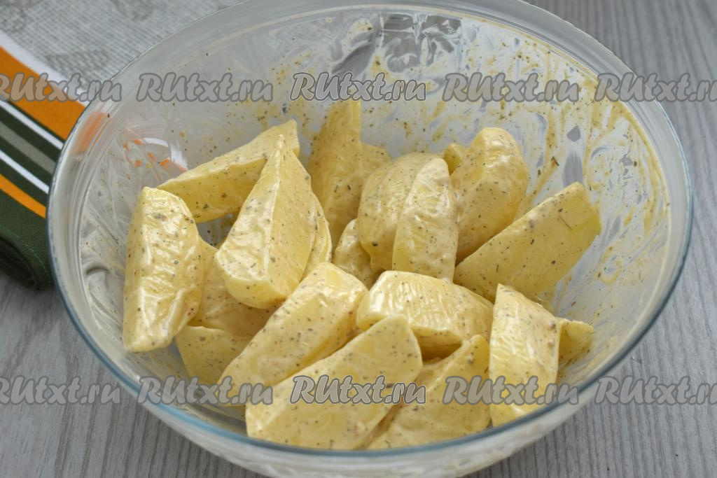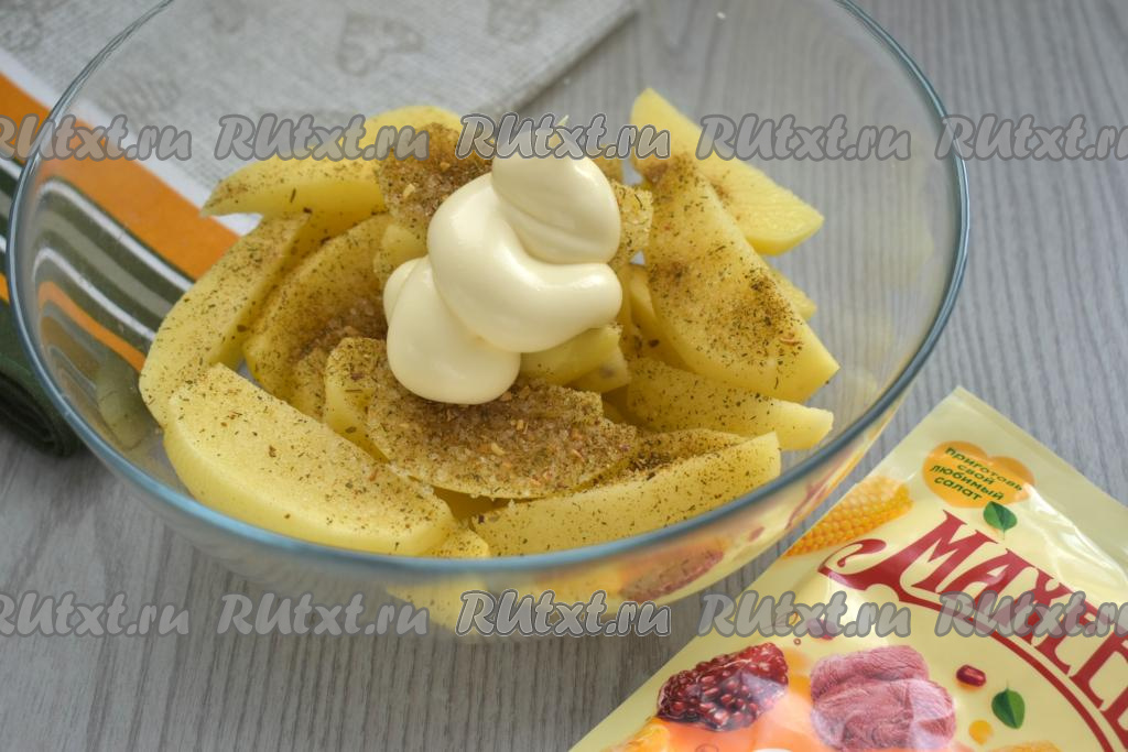 Тщательно перемешиваем ломтики картошки, равномерно покрывая их майонезом, маслом, солью и специями со всех сторон.