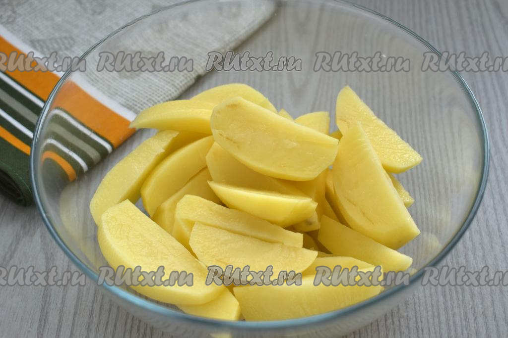 Нарезаем картофель на ломтики примерно одинакового размера, кладём в глубокую миску.
