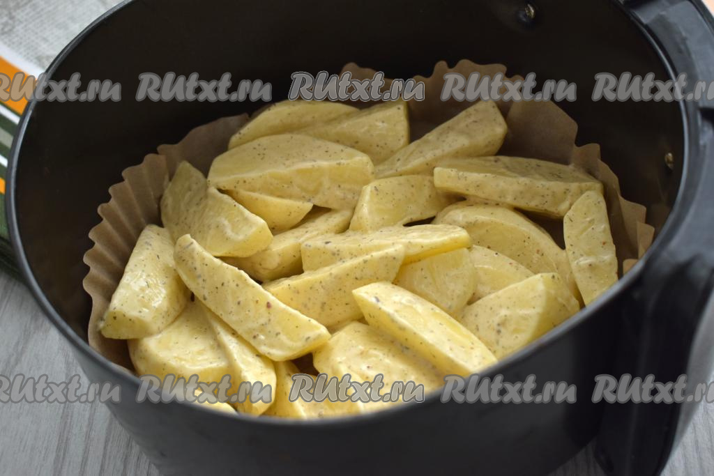 Застилаем чашу аэрогриля пергаментом. Выкладываем в аэрогриль ломтики картошки, покрытые майонезом. Отправляем чашу в аэрогриль. Включаем аэрогриль на 180 градусов, время устанавливаем на 35-40 минут.