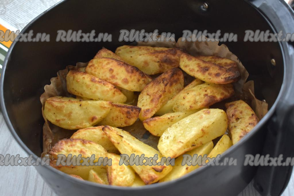 В середине запекания картофельные ломтики нужно перемешать. Для этого достаём чашу из аэрогриля, перемешиваем картошку и отправляем обратно запекаться до готовности. Для того чтобы проверить готовность картофеля, проколите ломтик картошки вилкой, если вилка входит легко, значит блюдо готово.