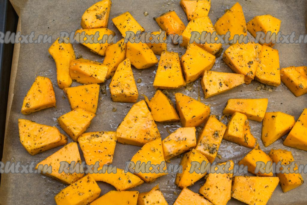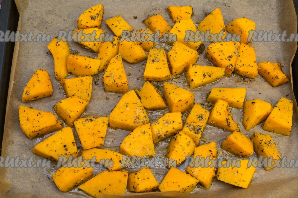 Противень застелить пергаментом (или фольгой), затем выложить кусочки тыквы в один слой.
