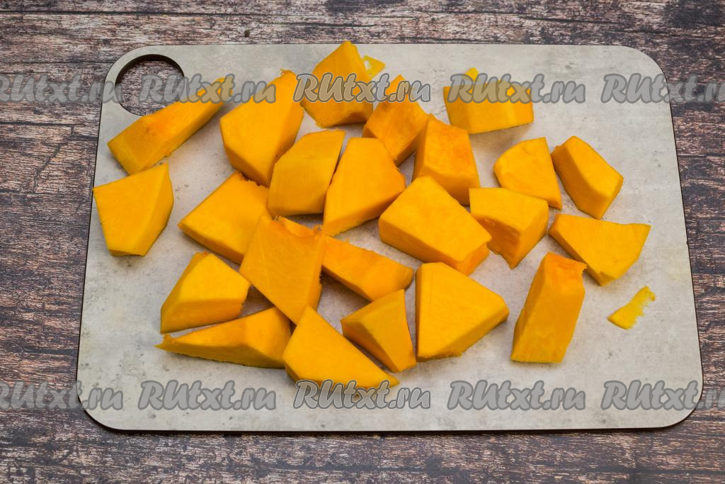 Тыкву очистить от кожуры, семечек и волокнистой части. Для запекания я взяла 1 килограмм 200 грамм очищенной тыквы. Нарезать очищенную тыкву на достаточно крупные кусочки примерно одинакового размера.
