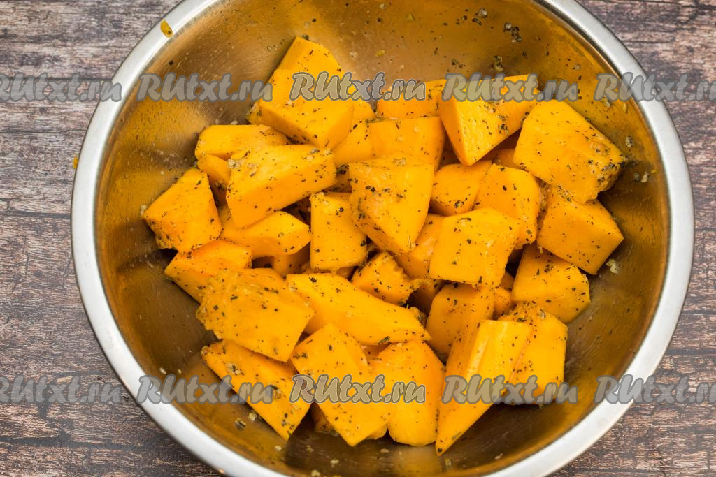 В миску с тыквой выложить смесь из растительного масла, базилика и чеснока. Хорошо перемешать, покрывая кусочки тыквы пряной смесью со всех сторон.