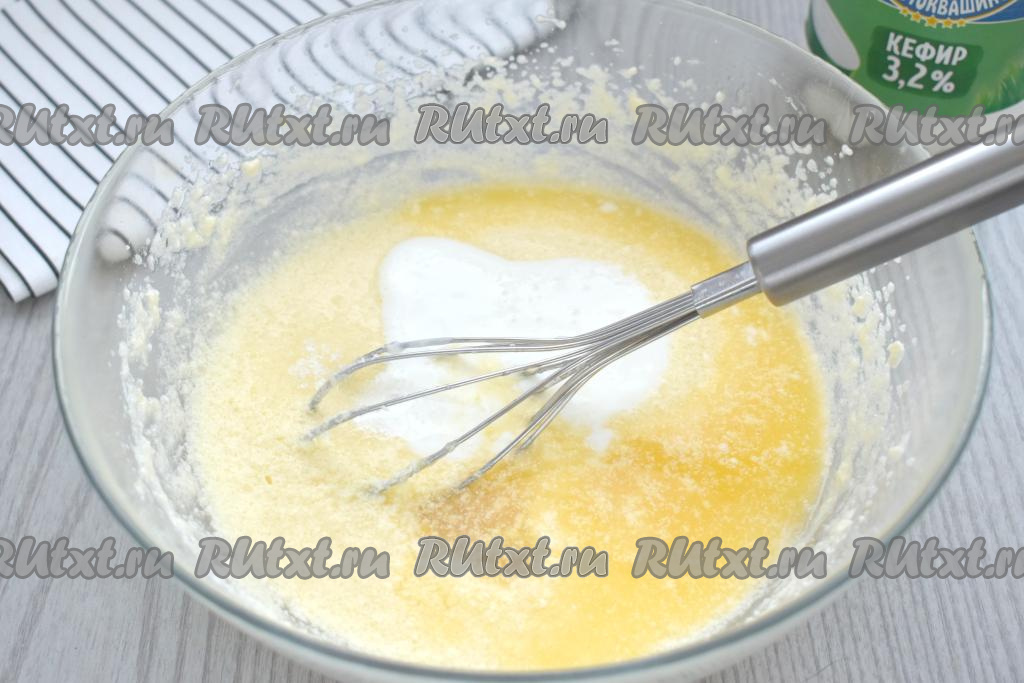 Тесто для этого пирога замешивается на кефире, для того чтобы погасить кислотность кефира и при этом пирог получился воздушным, в тесто добавляется и разрыхлитель, и сода.