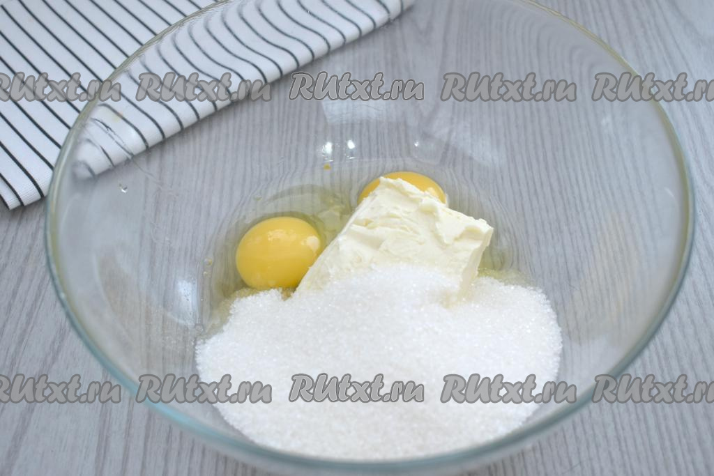 Сливочное масло должно быть комнатной температуры, поэтому его заранее нужно достать из холодильника. В отдельной ёмкости смешиваем кефир любой жирности (я использовала жирностью 3,2%) и соду, перемешиваем и оставляем на время, пока будем заниматься другими ингредиентами. В глубокую миску выкладываем сливочное масло комнатной температуры, добавляем сахар и сырые яйца.