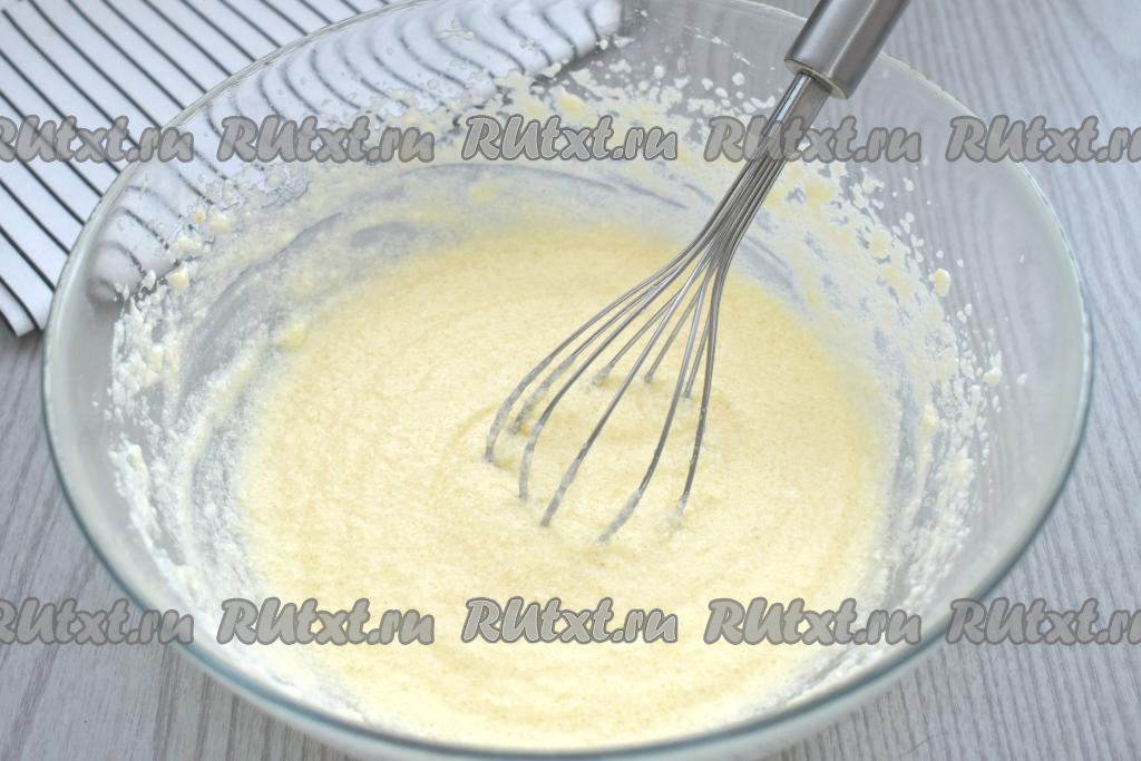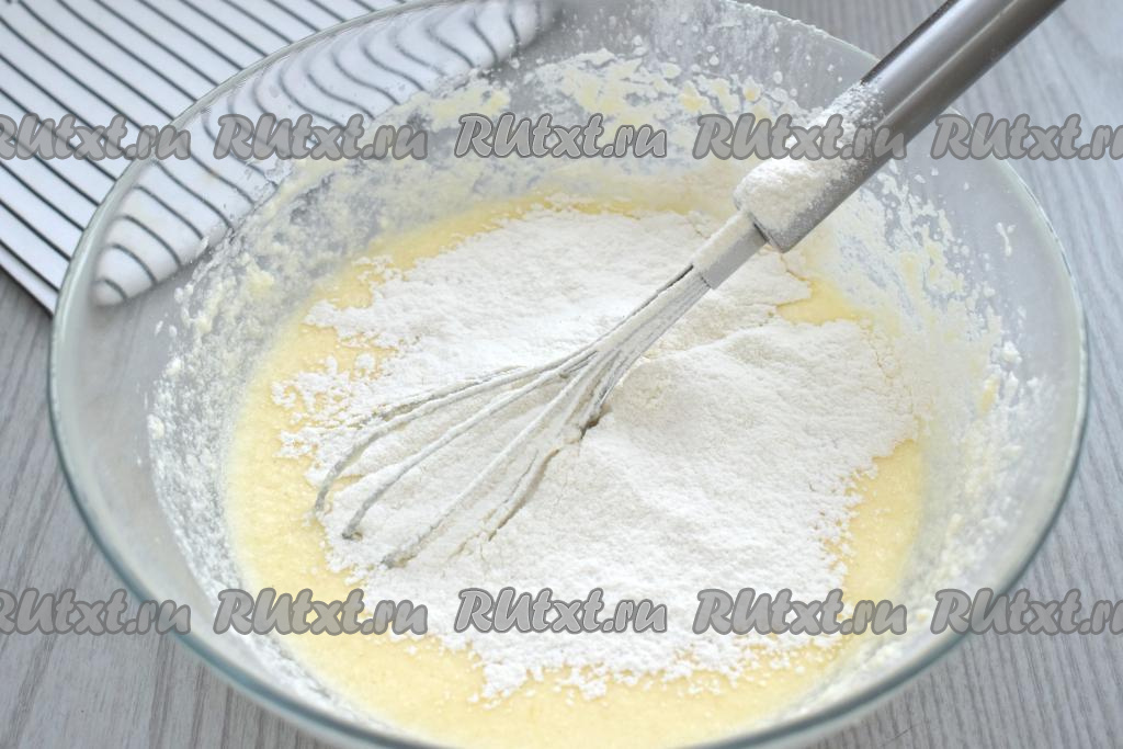 В получившуюся смесь просеиваем 100 грамм муки, добавляем разрыхлитель, перемешиваем венчиком.