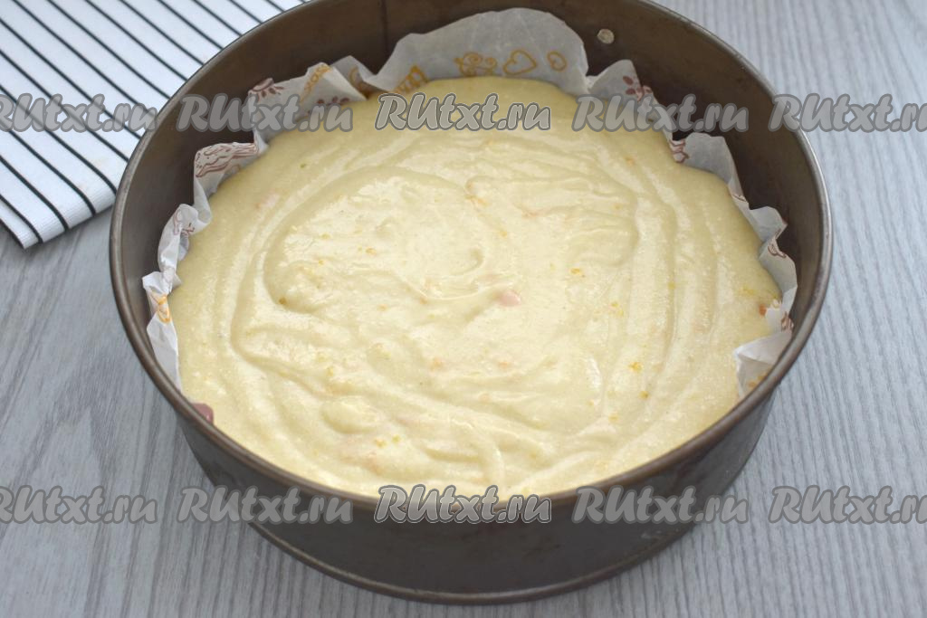 Понемногу добавляя оставшуюся муку и каждый раз полностью вмешивая её венчиком, замешиваем однородное тесто, напоминающее сметану средней жирности. Как только добились теста нужной густоты, значит больше муку добавлять не нужно. В зависимости от жирности кефира, величины яиц, вам может потребоваться немного больше или меньше муки, чем указано в ингредиентах, поэтому советую ориентироваться именно на густоту теста для пирога. Добавляем в тесто апельсиновую цедру, хорошо перемешиваем.