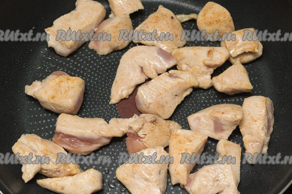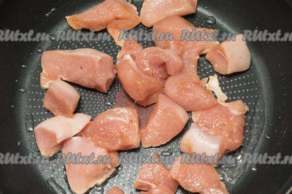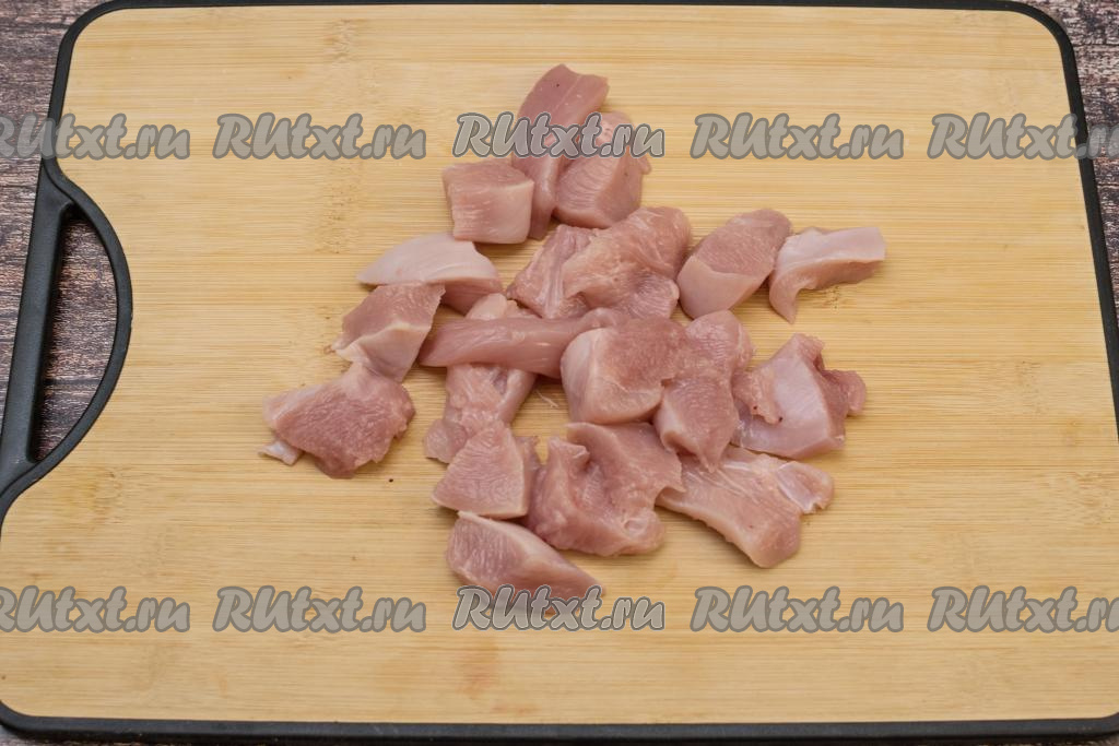 Куриное мясо нарезать на кубики с размером стороны 3-4 сантиметра.
