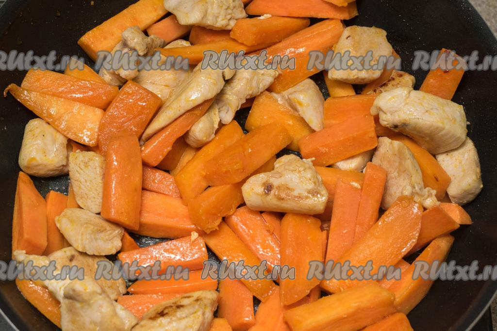 Перемешать и жарить курицу с бататом, периодически перемешивая, в течение 10 минут.