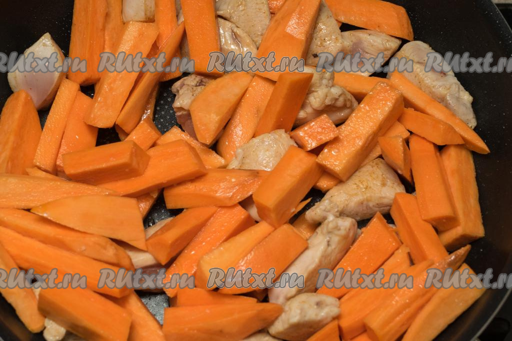 После того как мясо курицы приобретёт румяную корочку, уменьшить огонь до среднего, выложить в сковороду батат, влить ещё 1-2 столовых ложки масла.