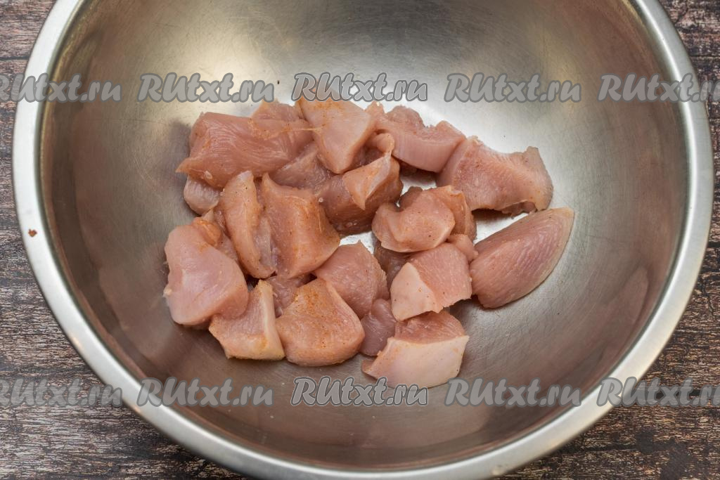 Сложить нарезанное куриное мясо в миску, посолить, добавить любимые специи для птицы, тщательно перемешать.
