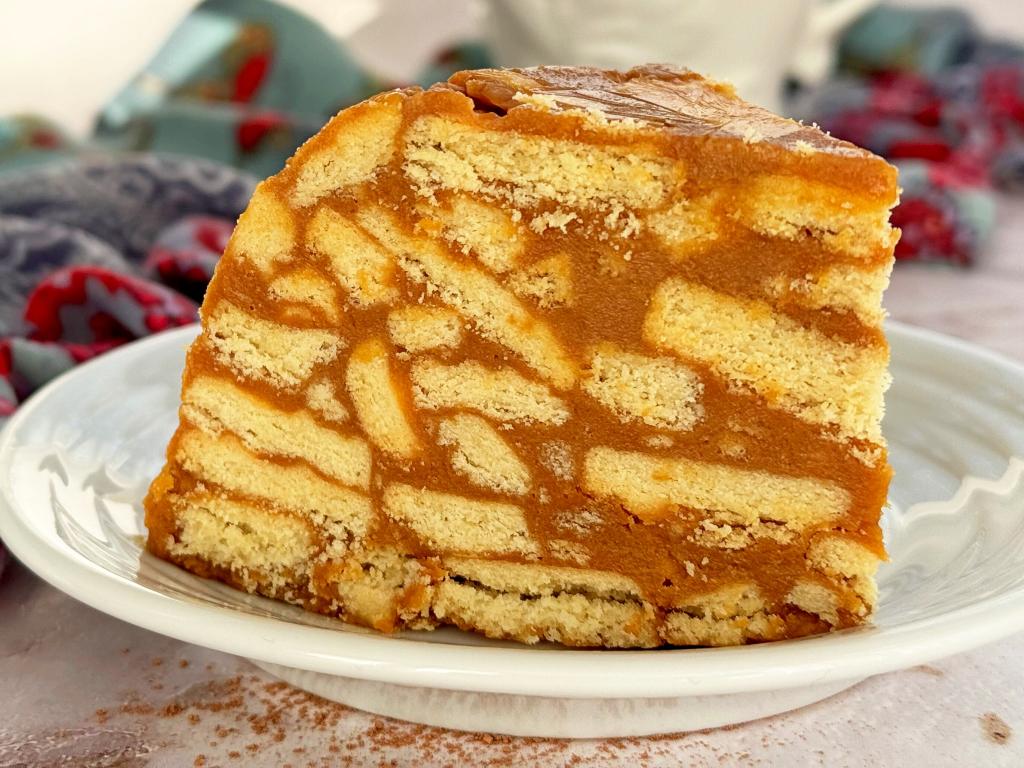 А вот как кусочек этого десерта без выпечки аппетитно выглядит в разрезе. Песочное печенье пропитывается сгущёнкой и маслом, поэтому торт получается и вкусным, и очень нежным.