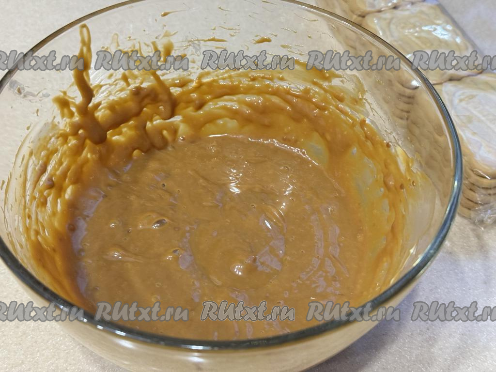 Добавить кусочки печенья в миску с кремом из сгущёнки и масла.