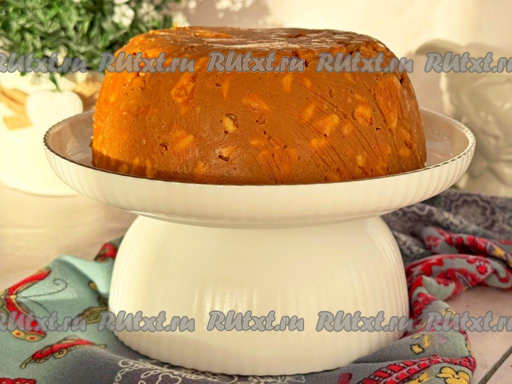 На следующий день, убрать края плёнки, накрывающие торт. Аккуратно перевернуть торт на тарелку, плёнку убрать.