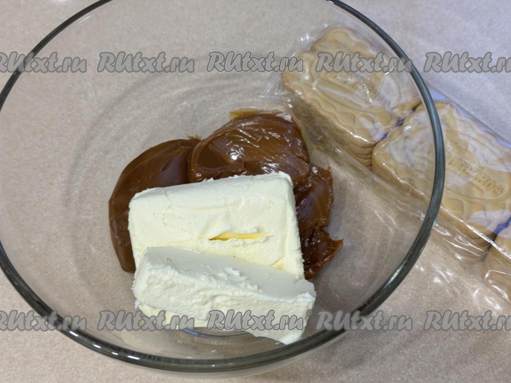 Подготовить продукты. Сливочное масло предварительно достать из холодильника, чтобы оно успело согреться при комнатной температуре и стать достаточно мягким. Песочное печенье подойдёт любое, я взяла классическое "Юбилейное" печенье.