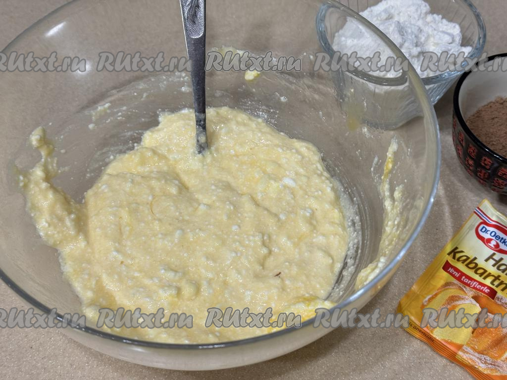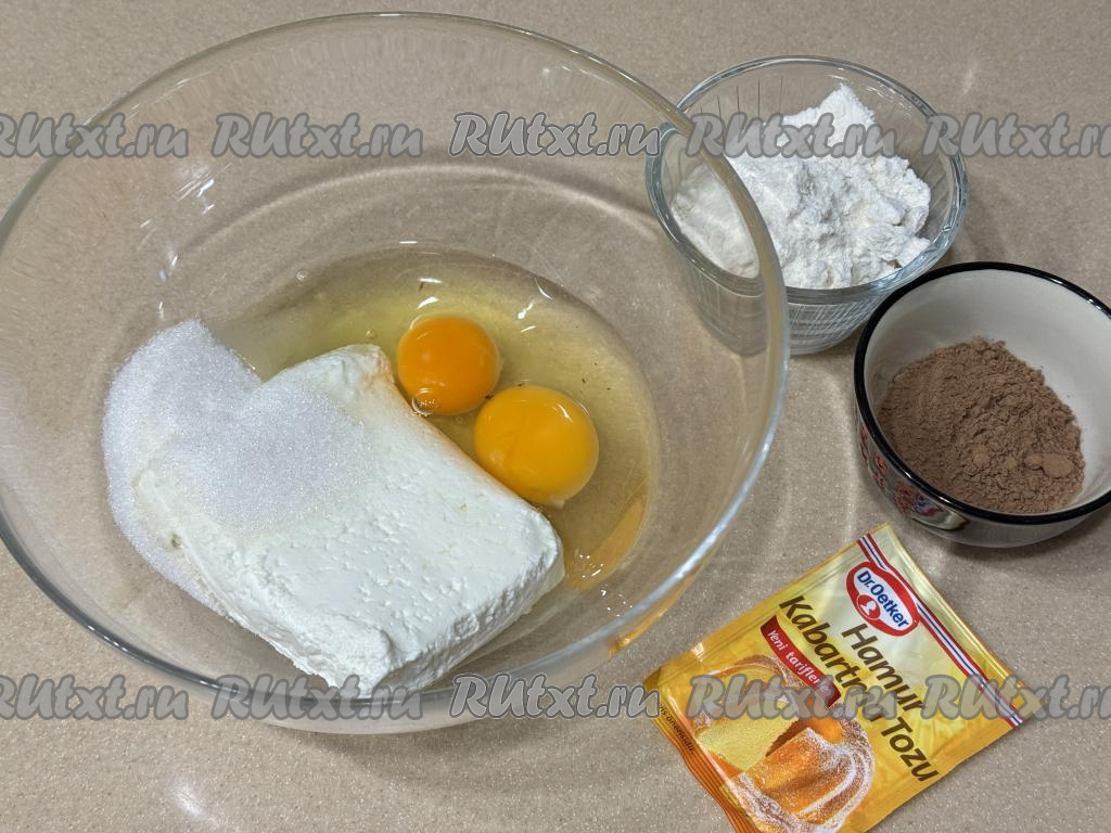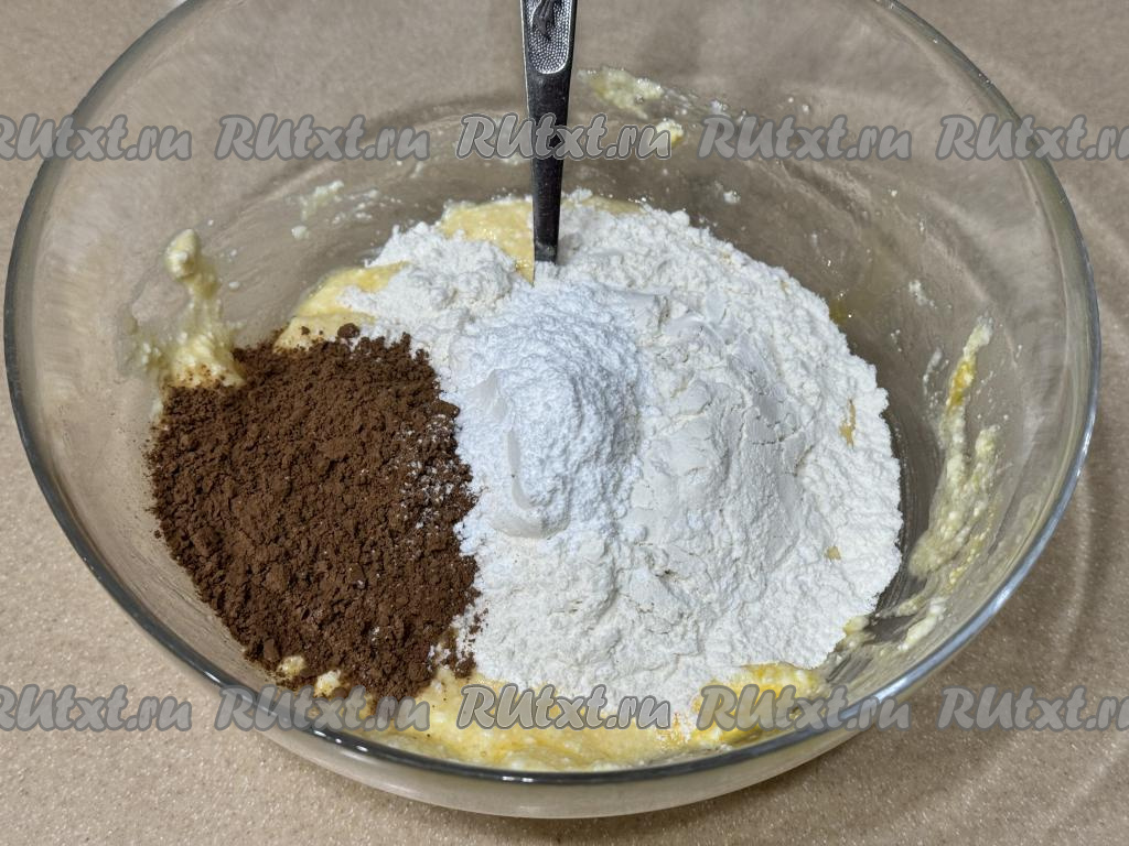 В миску с творожной массой всыпать муку, какао и разрыхлитель.