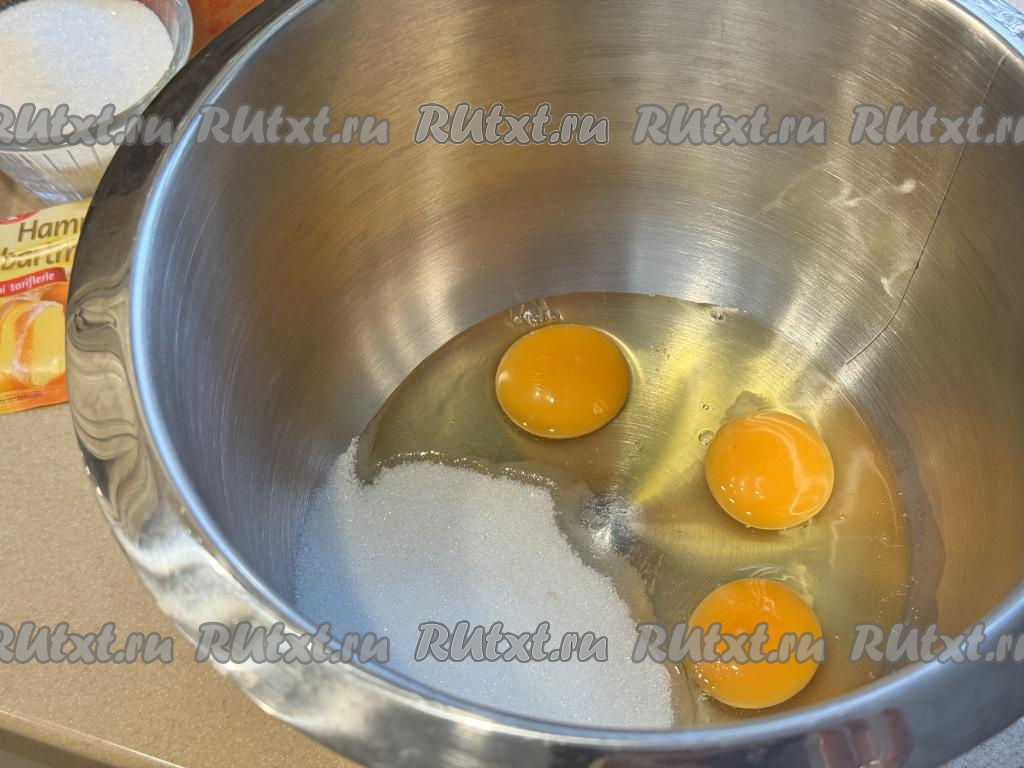 Прежде всего замесим песочное тесто для шарлотки. Для этого в чашу миксера нужно вбить сырые яйца, всыпать сахар. На максимальных оборотах миксера взбить яйца с сахаром в течение 6-7 минут. В процессе взбивания масса должна стать более светлой, увеличиться в объёме.