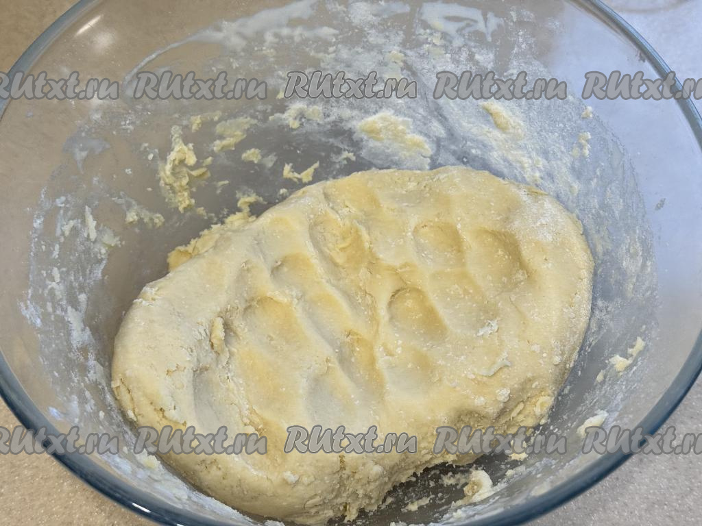 Вначале перемешивать песочное тесто столовой ложкой, а затем замесить руками нежное, пластичное тесто. При необходимости частями всыпать оставшуюся муку, каждый раз тщательно вмешивая её. Как только тесто перестанет липнуть к рукам, но будет мягким, значит больше муку добавлять не нужно. Долго песочное тесто вымешивать не нужно, достаточно просто собрать его в ком.