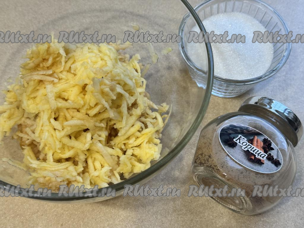 В миску с натёртыми яблоками всыпать сахар и корицу, перемешать и начинка для песочной шарлотки готова.