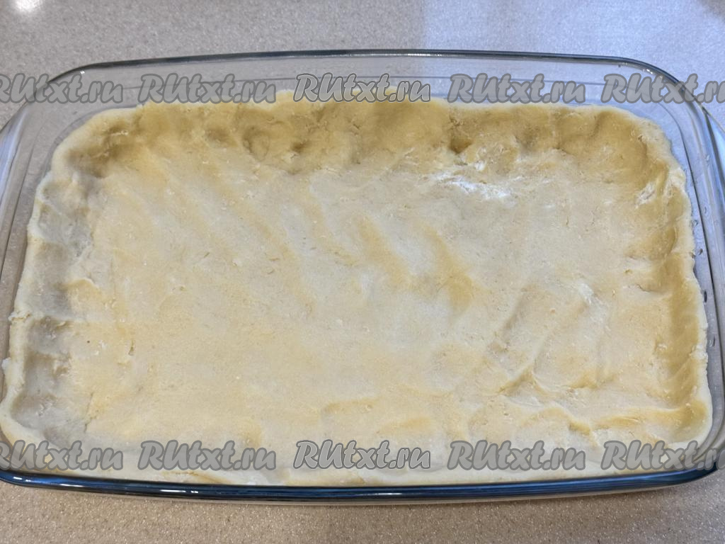 Разделить тесто на две равные части. Одну часть поместить в пакет и убрать в морозилку минут на 25-30. Вторую часть теста выложить в форму для выпечки (я выложила в прямоугольную форму размером 28 сантиметров на 18 сантиметров, но можно использовать и круглую форму). Распределить тесто по дну формы, сформировать невысокий бортик.