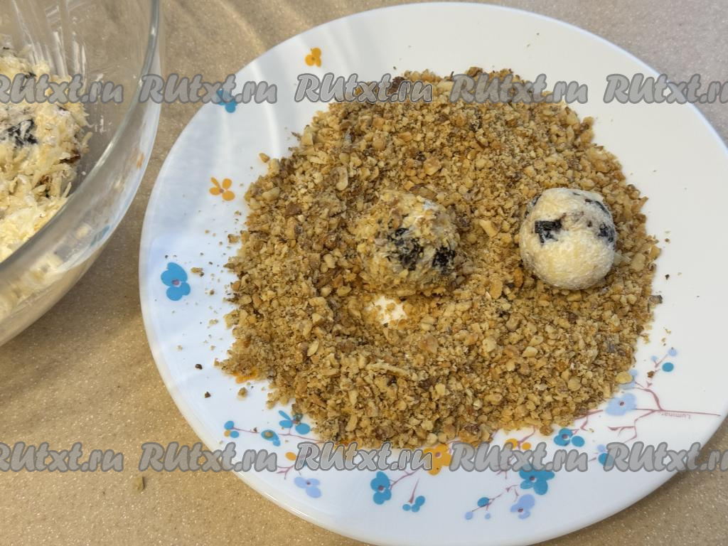 Измельчённые грецкие орехи насыпать на тарелку. Периодически смачивая руки водой, из массы, получившейся из сыра и чернослива, сформировать шарики размером чуть меньше, чем грецкий орех. Обвалять каждый шарик в ореховой крошке со всех сторон.