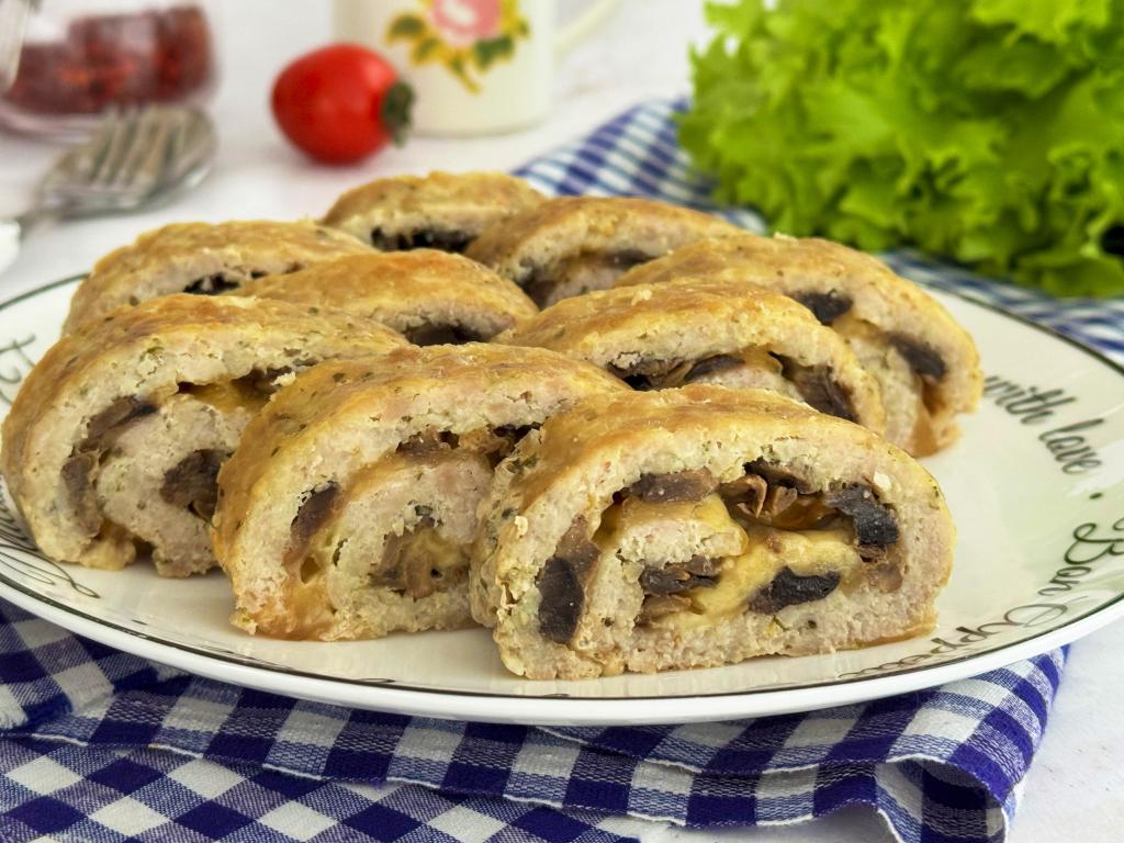 Мясной рулет, нарезанный на кусочки, выложить на плоскую тарелку и подать к столу. Сочная начинка из грибов и сыра прекрасно сочетается с запечённым фаршем, в результате получается очень нежное и сытное блюдо, которое можно подать и к повседневному, и к праздничному столу.