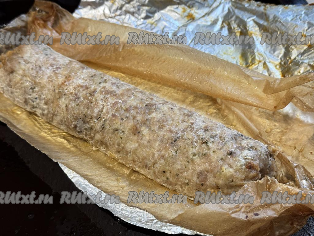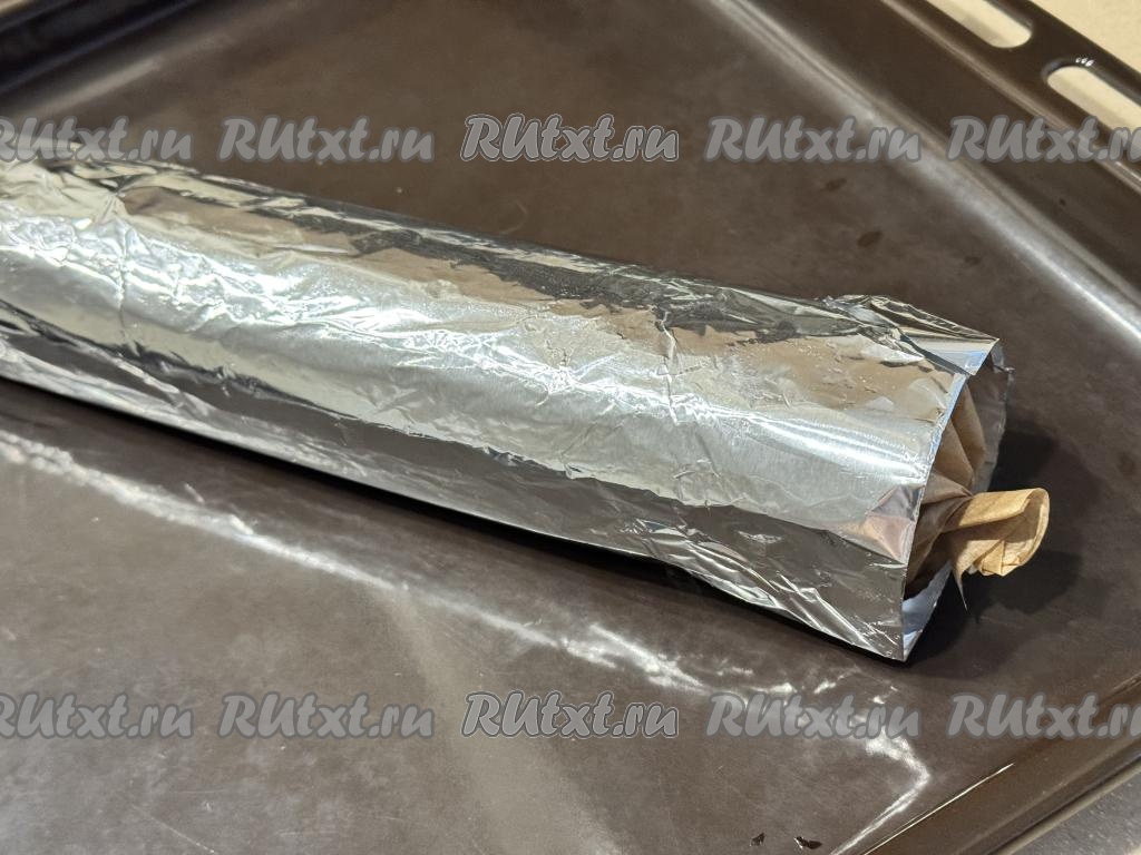Рулет завернуть в пергамент, закрывая рулет, как конфету, со всех сторон, а затем ещё и в лист фольги. Переложить рулет на противень.