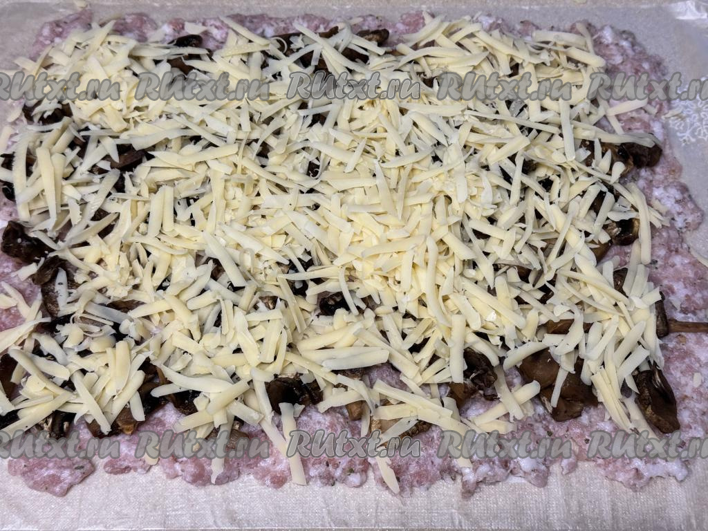 Поверх грибов равномерно распределить сыр, натёртый на крупной тёрке.