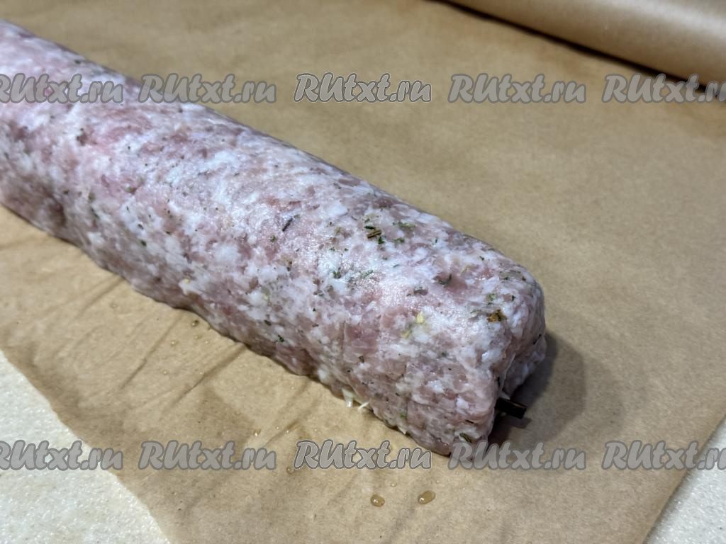 На обычный целлофановый пакет, расстеленный на столе, выложить фарш и равномерно распределить его ровным слоем. Получится прямоугольник из фарша.