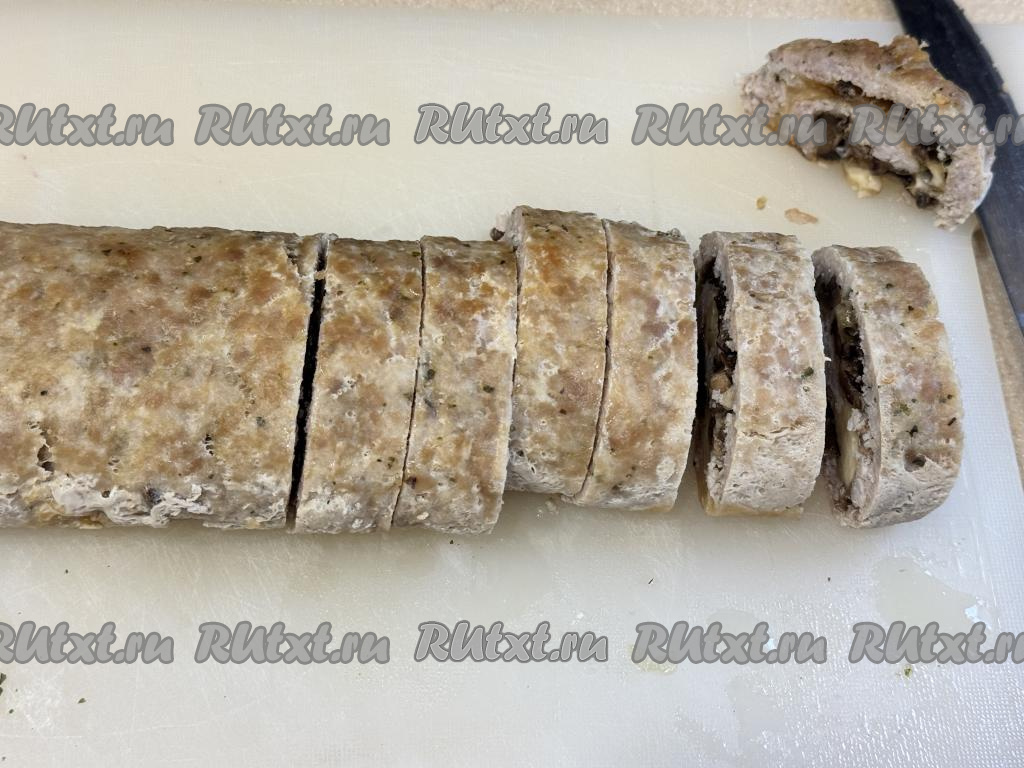 Дать мясному рулету немного остыть, а после этого нарезать на порционные кусочки.