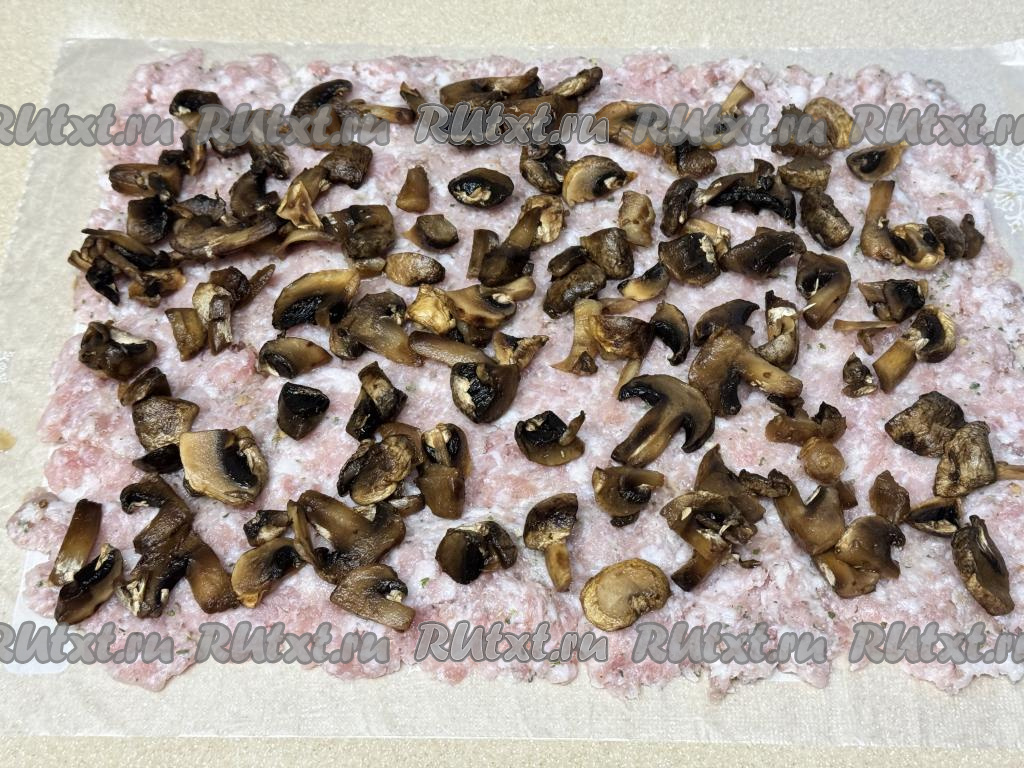 Затем на фарш выложить грибы.