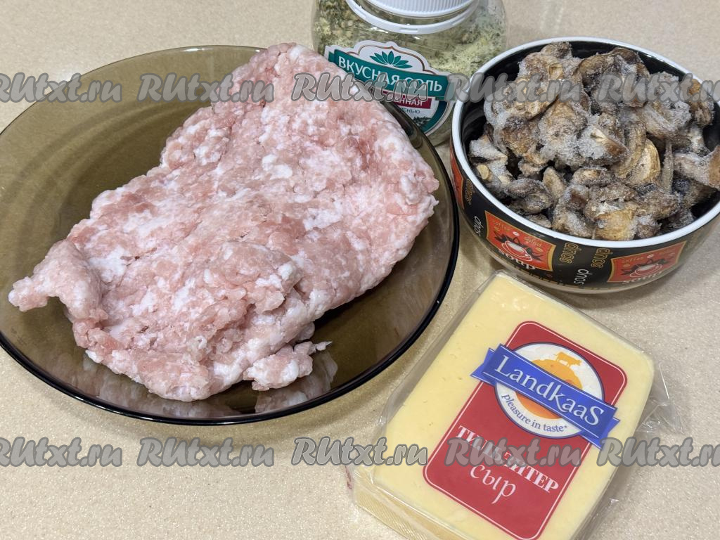 Подготовить продукты. Шампиньоны можно использовать свежие или замороженные. Если вы будете готовить, как и я, с замороженными грибами, тогда их нужно будет разморозить, лишнюю воду слить. Свежие шампиньоны нужно будет промыть водой, обсушить, нарезать на пластины. Для этого блюда можно взять любой фарш из одного или нескольких видов мяса. Фарш можно приготовить в домашних условиях, пропустив кусочки мяса (я использовала свинину) через мясорубку, но можно использовать и покупной фарш.