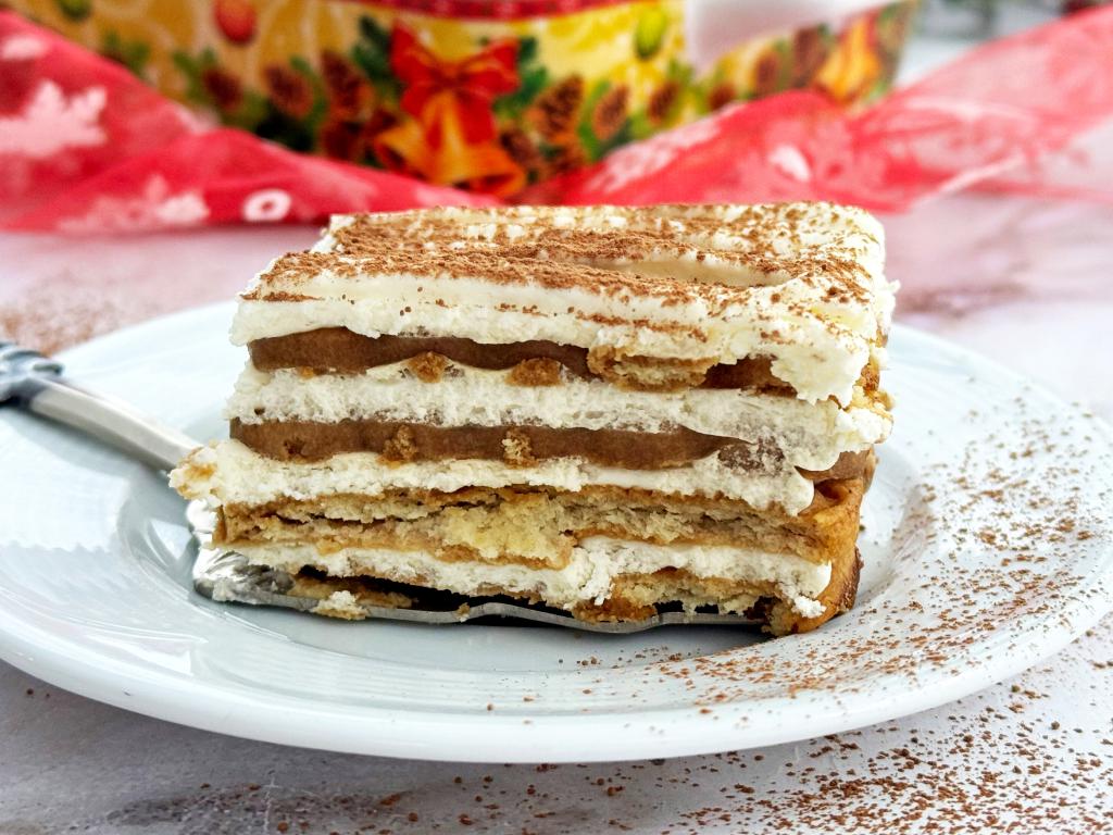 Тирамису, приготовленный из печенья "Юбилейное", творожного сыра и сливок, нарезать на кусочки и подать к чашечке чая или кофе.